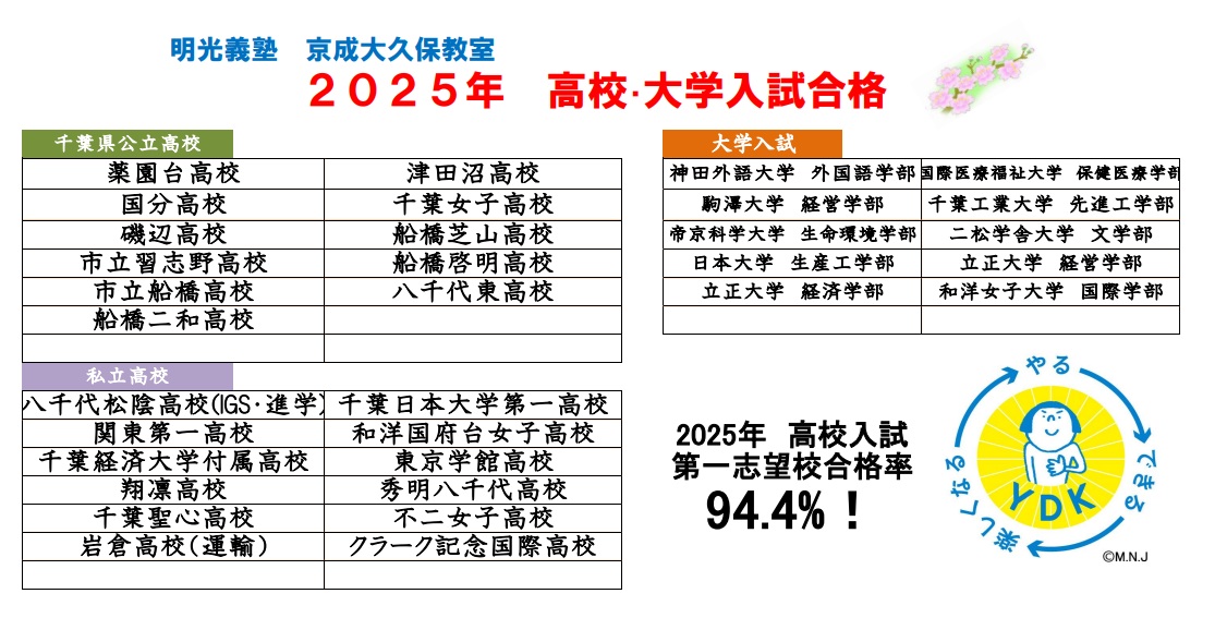 【2025年度合格実績】薬園台高校、津田沼高校、国分高校、千葉女子高校、磯辺高校、船橋芝山高校、市立習志野高校、船橋啓明高校、市立船橋高校、八千代東高校、船橋二和高校、白河高校(福島県)八千代松陰高校(IGS)、千葉日本大学第一高校(進学)、関東第一高校、和洋国府台女子高校(進学)、千葉経済大学付属高校(文理)、東京学館(文理)、翔凛高校(進学)、秀明八千代高校(文理)、千葉聖心高校、不二女子高校、岩倉高校、クラーク国際記念高校